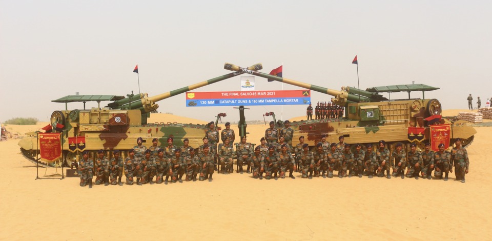 "The turret-less vehicle has an open area in the centre for the gun and crew but retains the driver's position and includes a horizontal metal shield for overhead protection. 130 mm Self Propelled M-46 Catapult Guns decommissioning ceremony, March 2021. To withstand higher firing stresses and to cater for longer recoil the Vijayanta tank's hull has been elongated with seven bogie wheel stations on either side. The stability to the vehicle during firing is provided by unique hydraulic suspension locking system. The self-propelled medium artillery gun can fire both HE and AP ammunition and has a maximum range of 27 km. The gun has a limited static traverse 12½% on either side and an elevation of +45% to -2%. The system can stow 30 rounds of separate loading ammunition.
