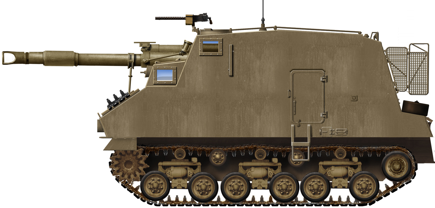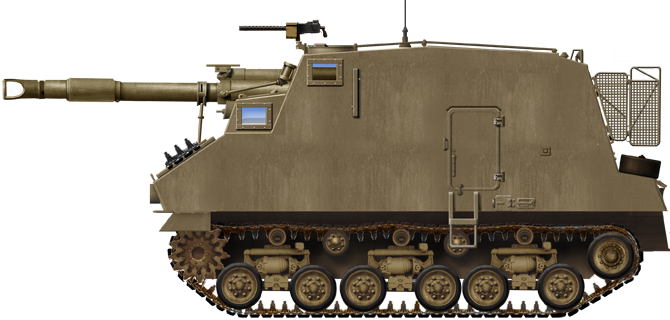 The L-33 as its name suggested mounted the 3 caliber SOLTAM 155mm ordnance derived from the standard M-68 towed gun with modification of the chassis to fit inside the hull. This howitzer has a maximum range of 21 km and best rate of fire of about 6 rpm. Its mount authorized an elevation of 52° and depression of -3° with a traverse of 60°, 30° either side, both elevation and traverse are manual. The Israeli managed to cram 60 round inside the hull on all aavailable spaces, of which 16 are ready rounds. The 155 mm caliber made it compatible with similar US and NATO rounds. It fired the M107 HE projectile up to a maximum velocity of 725 m/s, 9.14 Kg TNT warhead for an equivalent of 61mm of penetration. The barrel had single baffle muzzle brake, bore evacuator and a travel lock. Apart this howitzer, the crew og eight had their own small arms and a pintle-mounted 7.62mm machine for self-defense. The commander’s hatch indeed was provided with a gun ring, possibly string enough to mount a M-2 Browning .50 cal. but more commonly the FN-MAG 7.62 mm LMG with 1000 rounds were carried. The driver also had night vision capabilities with an IR optional vision block forward.