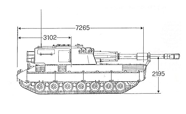 Argentinian TAM CVA 155: The Vehículo de Combate de Artillería de 155 mm has an elongated version of the TAM chassis and the Italian Oto Melara’s Palmaria turret and a main 155 mm (6.1 in) gun-howitzer. The original Palmaria was developed on the basis of the OF-40, a locally built Italian Leopard. Both models shared a lot of common parts. 28 rounds are stored, including 23 in the turret bustle. The maximum range is about 45 to 50 km with additional round booster. In addition, there is a roof-mounted FN MAG GMPG machine-gun. The VCA is the heaviest of all TAM variants, weighing 40 tons, and the slowest (55 km/h).