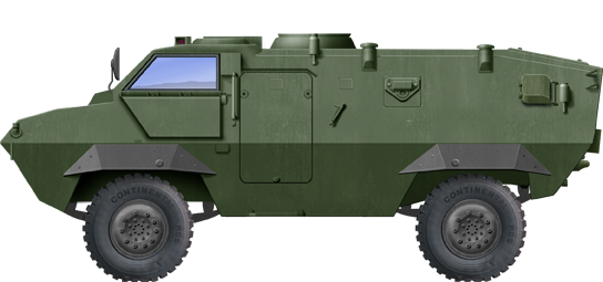 The North Macedonian Army APC was armed with a single "PKT" light machine gun at 7,62 mm with standard ammunition 7,62 x 54 R with a -10/+60 degree elevation and depression. Ballistic protection combines steel, ceramic and composite materials. The protection area over the cupola is about 0,7 m2. The forward nose can resist heavy MG fire (12,7mm) and AP rounds of all calibers. The main headlight joint to the LMG line of sight can light up over 400 m. On the right side, the North Macedonian vehicle has a bank of three smoke grenade dischargers of the type 902B "TUCHA" angled at 45°. It could create a smoke screen 200-300m around lasting for up to 2 minutes.