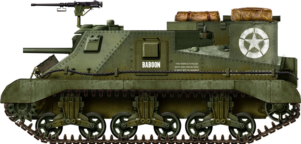 The vehicle still sported a main gun but it was a bogus pipe, fake barrel to deter potential observers. It's main armament was a do-it-all standard Browning M2 Heavy Machine Gun on a pintle with some elevation to deal with approaching planes. It was located on top of the bogus gun barbette,with the MH gunner now standing where the former casemate was located. The HMG moved on a rollerbear ring. The power of these heavy rounds was sufficient to shred any softskin vehicles and light armoured cars. Next was the standard equipment of these rear echelons gun crews, Browning service pistols an eventually two more more Grease Guns (M3 submachine guns). Like the M31 and M32 they had also access in limited quatities to mines (to secure the approaches of the gunnery field) and grenades for close encounters.specifications | |