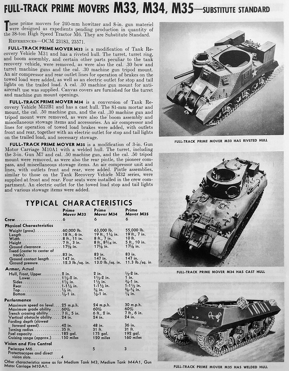 The M33 Prime Mover was an American World War II artillery tractor created by converting obsolete M3 Lee/Grant medium tanks for towing heavy guns and hauling equipment. It was based not directly on the M3 Medium Tank (Lee/Grant) chassis but on the M31 TRV derived from it after the failure of the T16 heavy cargo tractor prototype. It became the go-to all-terrain Heavy artillery prime mover, for the 203 mm/8-inch howitzer and 240 mm M1 "Black Dragon", heaviest piece of field ordnance deployed by the US Army in WW2. Apart the removal of the turret and an internal winch for gun-handling operations it was only defended by a cal.05 heavy MG, and saw service mainly with U.S. Army heavy artillery battalions in Italy, NW Europe and in the Pacific. It was an interim solution until more specialized artillery tractors like the M4, M5, and M6 High-Speed Tractors were available. The M33 was one of the three "susbtitute standards" used in 1944 with the M34 and M35 prime movers.